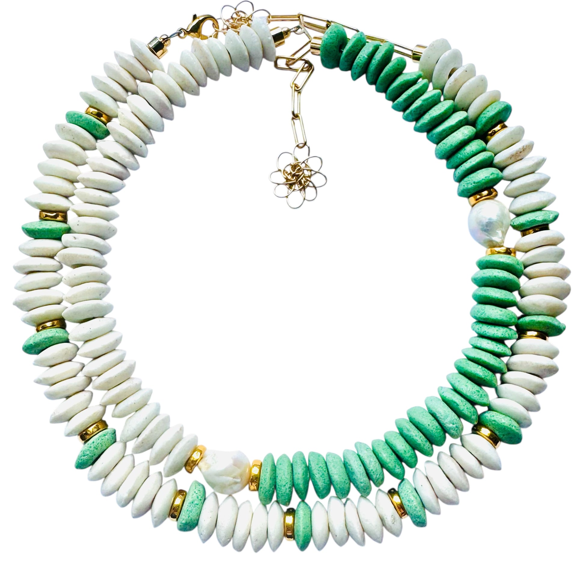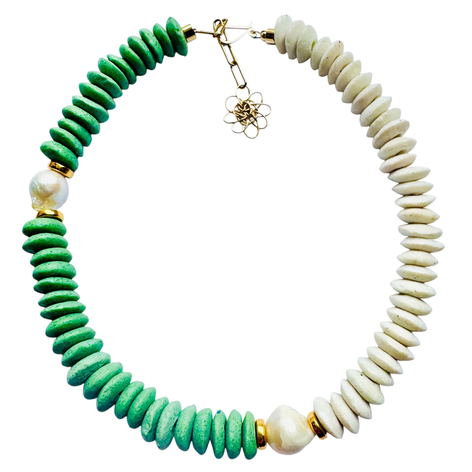 Experience a harmonious blend of African tradition and modern elegance with the Asante Cilantro Necklace. This exquisite piece is crafted from vibrant Ashanti African glass stones and freshwater baroque pearls, showcasing a captivating array of textures that reflect the rich heritage of African artistry.