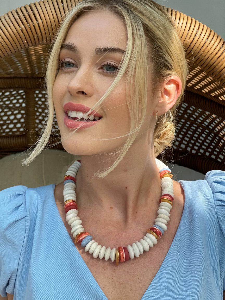 Experience a harmonious blend of African tradition and modern elegance with the Asante Red Coral Necklace. This exquisite piece is crafted from vibrant Ashanti African glass stones and stunning red spiny oyster, and freshwater pearls, showcasing a captivating array of colors and textures that reflect the rich heritage of African artistry.