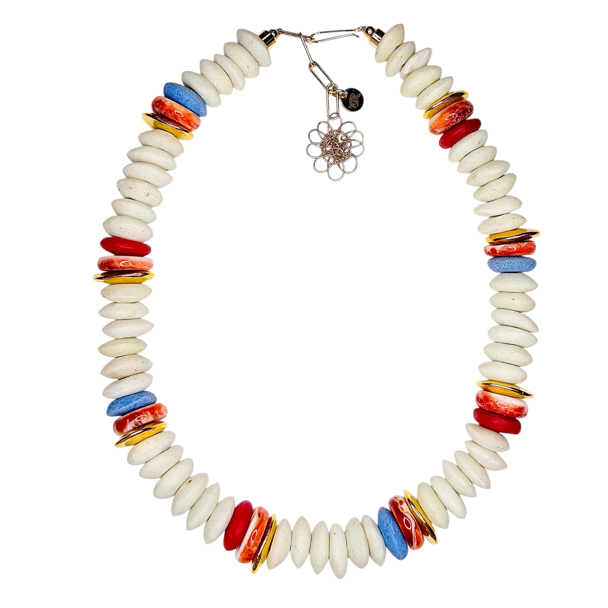 Materials : African Ashanti glass beads, red spiny oyster shells, freshwater pearls, gold ceramic beads. 14 kt gold-filled clasp and extender chain.