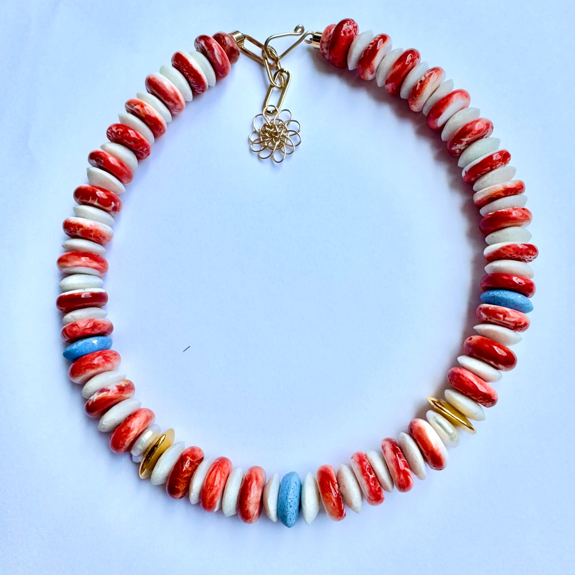 Express your love for fashion and freedom with the Bastille necklace from Le Lille X Collaboration. Featuring red coral, white and blue Ashanti stones, freshwater pearls, and gold accents. Dress up any outfit or keep it casual with jeans or a summer dress. The perfect accessory for any occasion, Bastille is adored by all and pairs perfectly with gold chains and pendants!