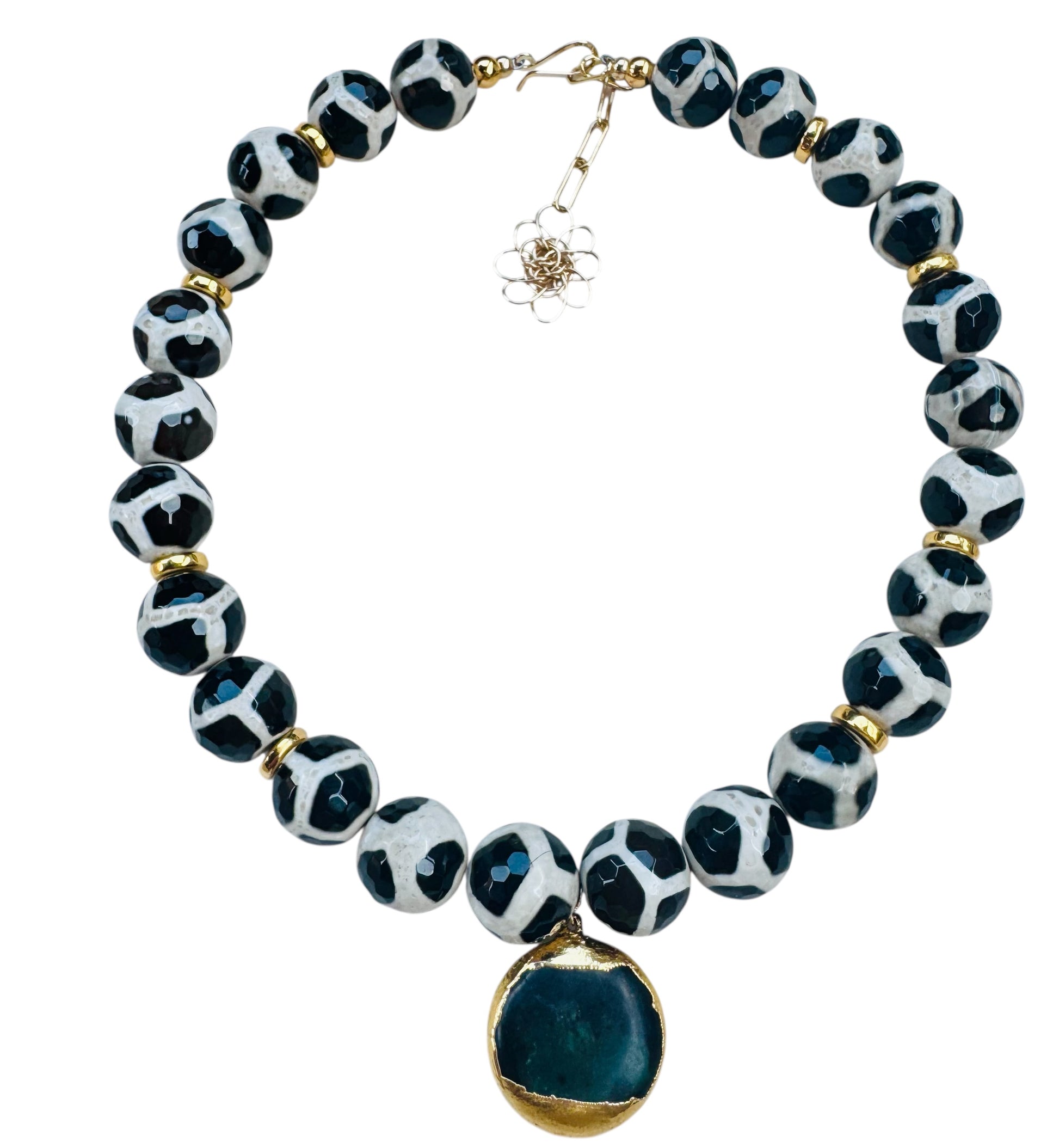 Stunning Tibetan agate, gold accents, with black agate pendant.