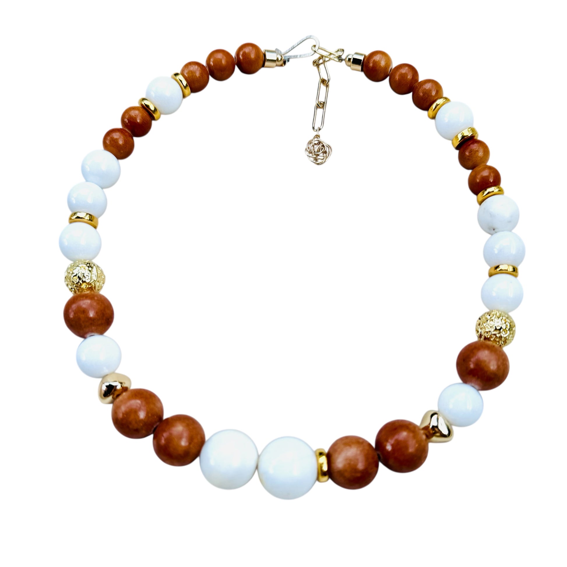 Introducing the Kimble Necklace in Carmel, a classic piece from the Cassandra Collection x Le Lille. This neutral necklace showcases a combination of white jade, natural white turquoise, baroque pearls, warm caramel colored jade, and gold accents creating a cool blend of neutral elegance.