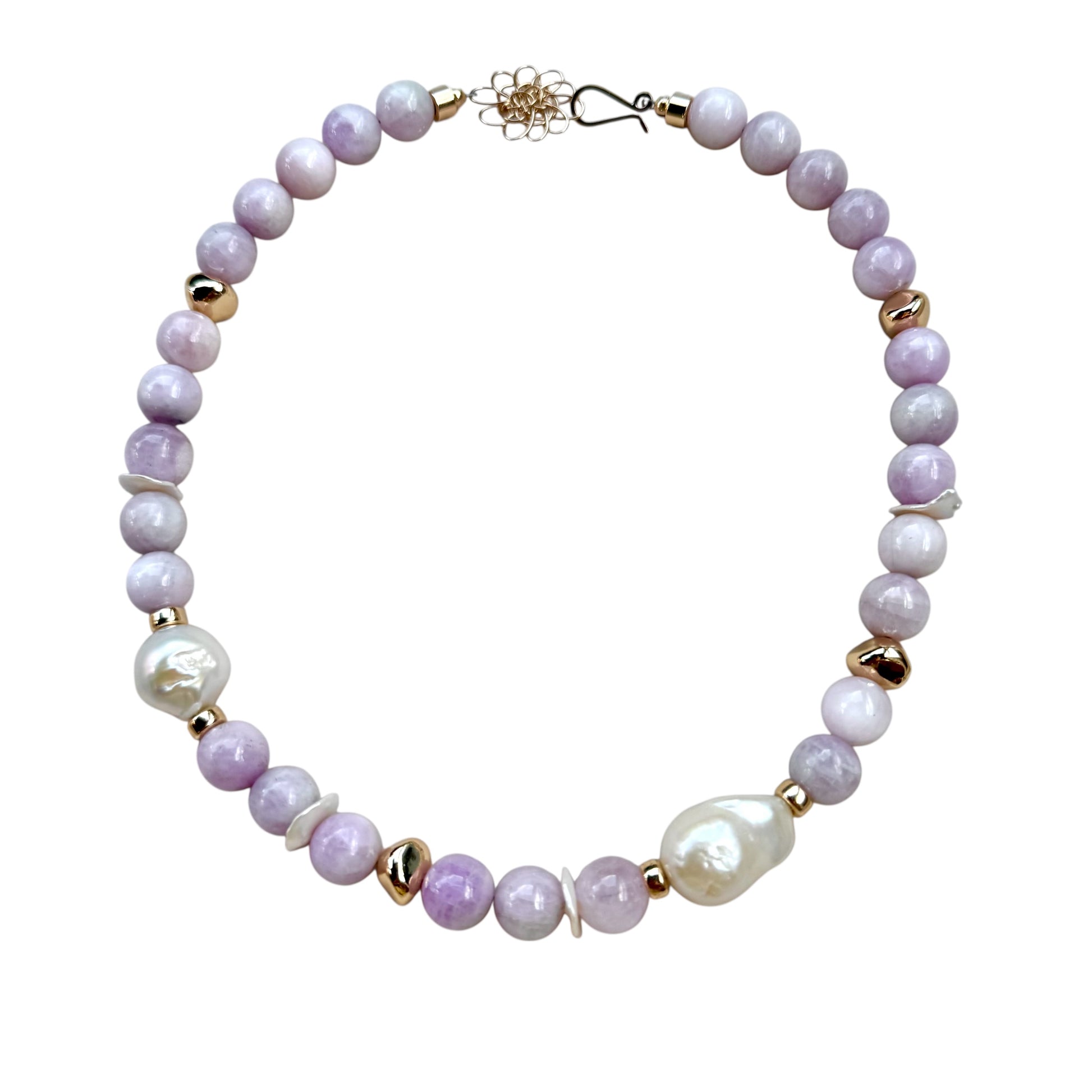 Gorgeous Lavender Kunzite, freshwater pearls, baroque pearls with gold accents.