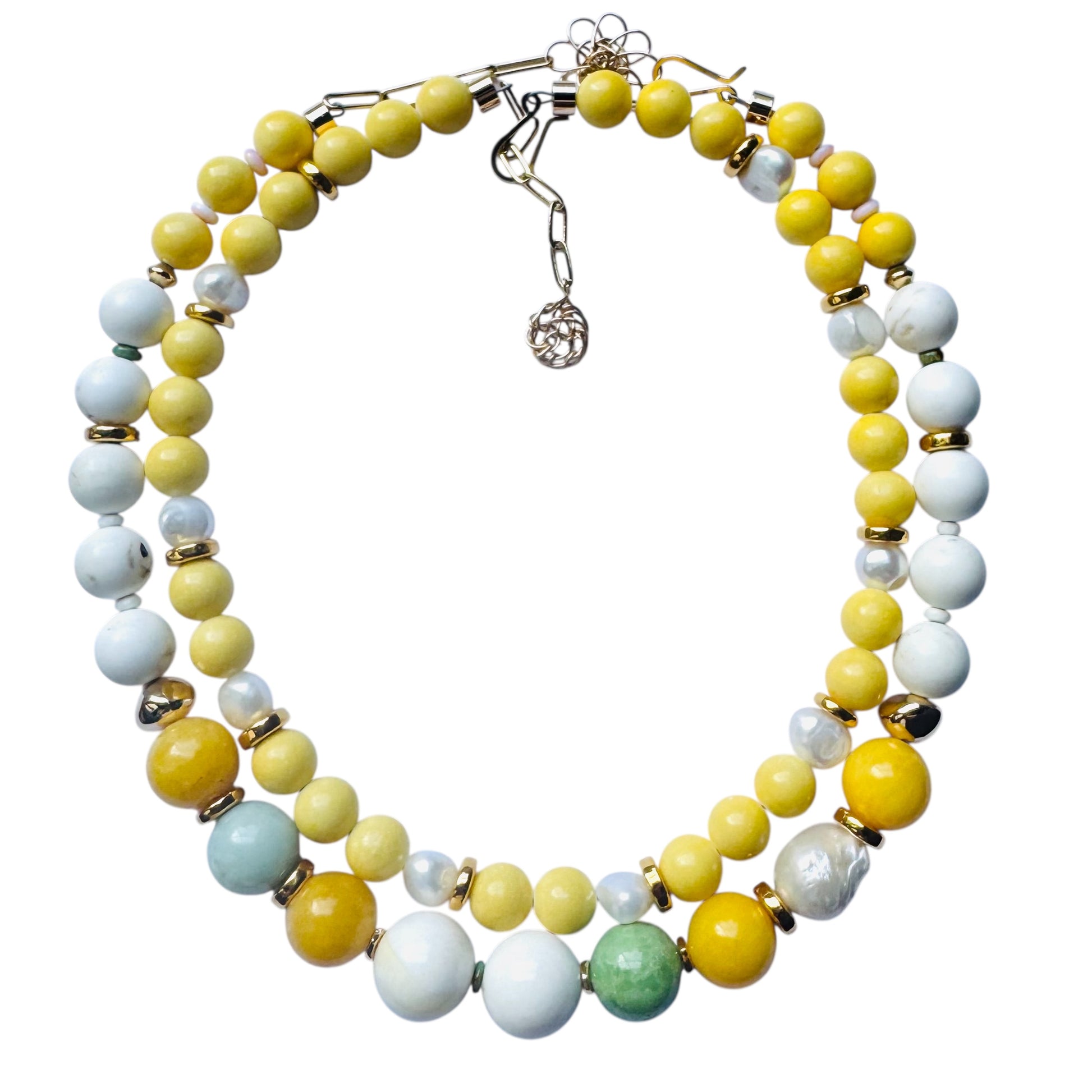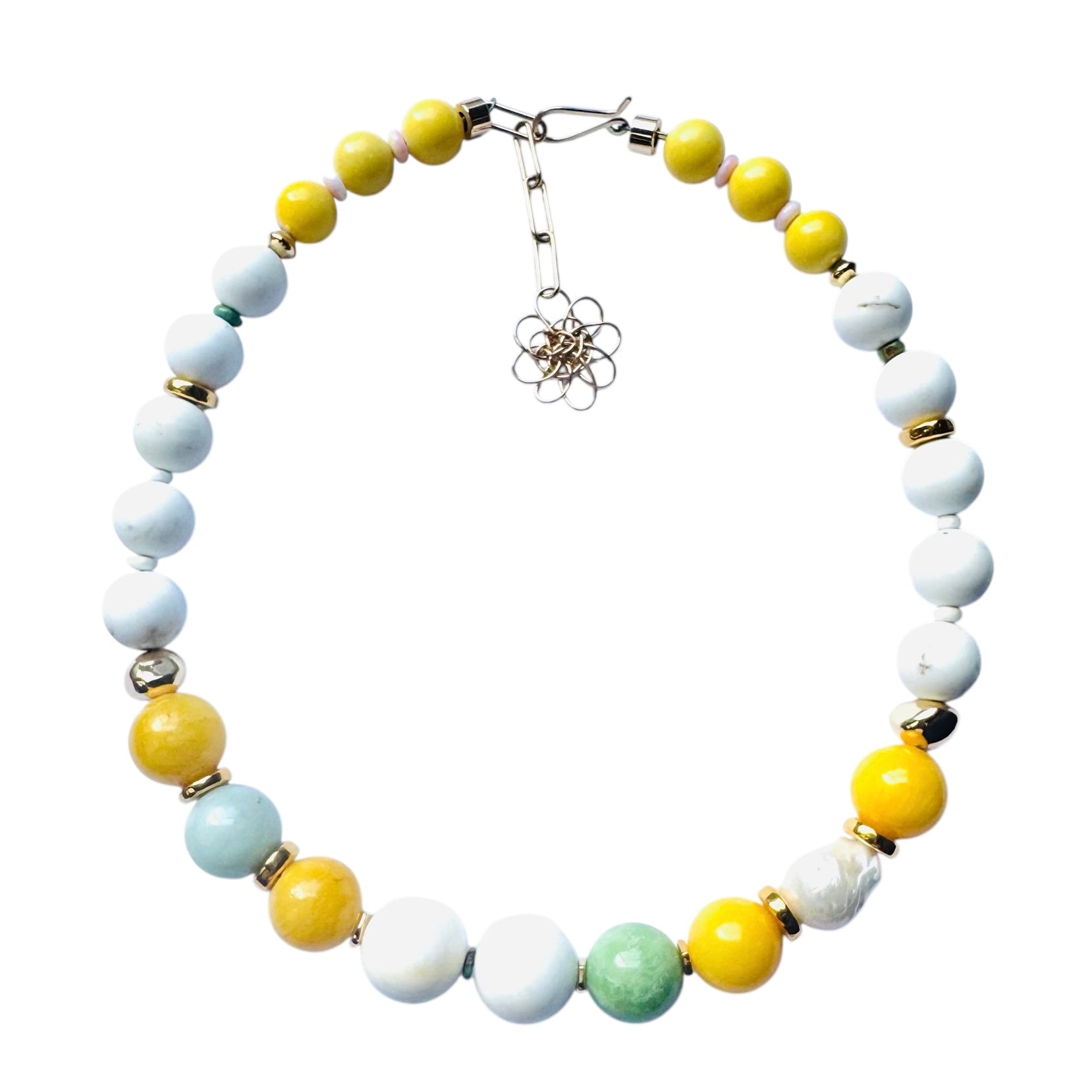 Length: 16 inches plus 2 inch extender chain Materials 10-16mm White and yellow jade, chrysoprase freshwater pearls, gold ceramic, 14kt gold filled clasp.