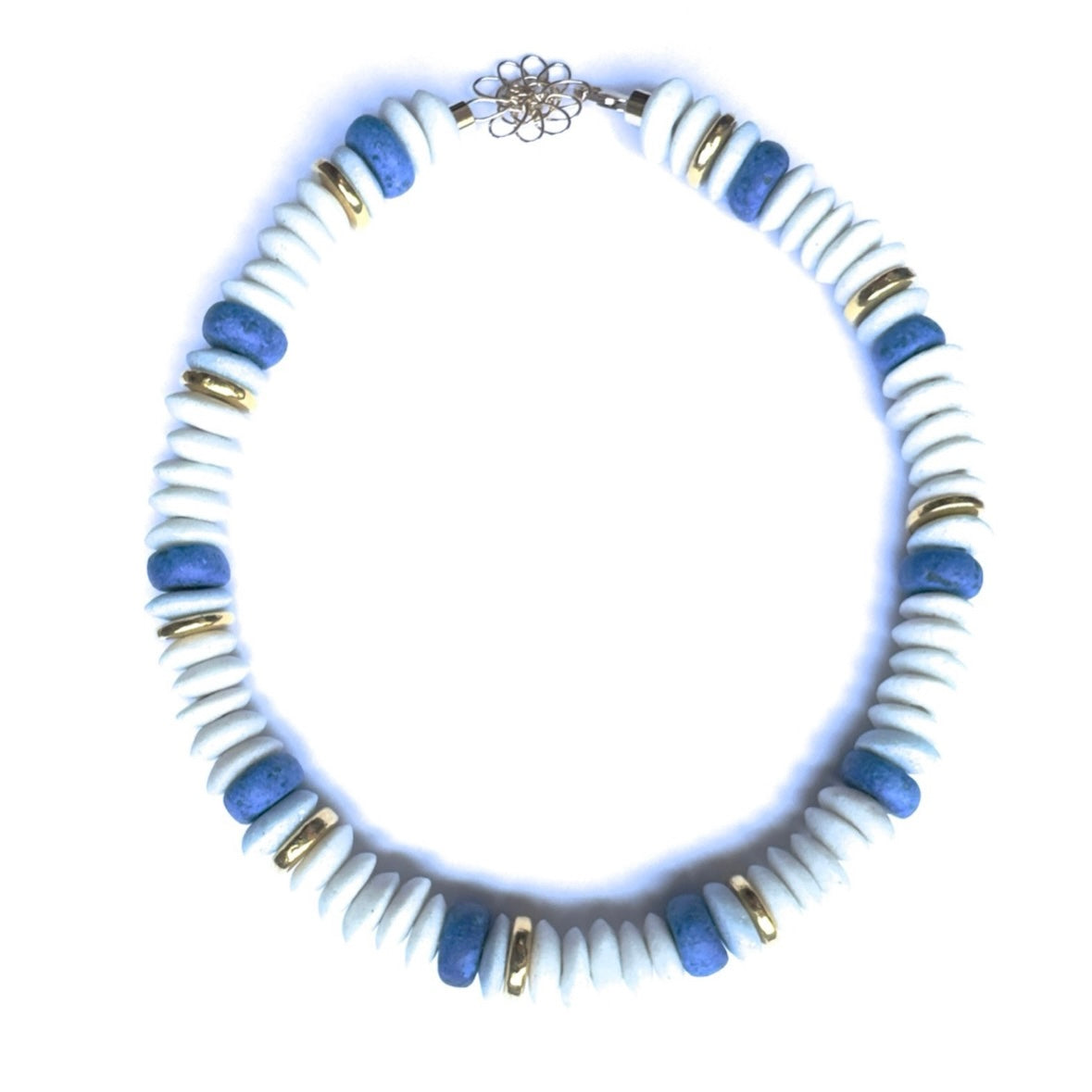 Get ready for summer vacation with the vibrant Mykonos Necklace. Crafted from an exquisite blend of white, sky blue, and royal blue Ashanti African glass beads, this necklace captures the spirit of sun-soaked beaches and azure waters, making it the perfect accessory for your summer adventures.
