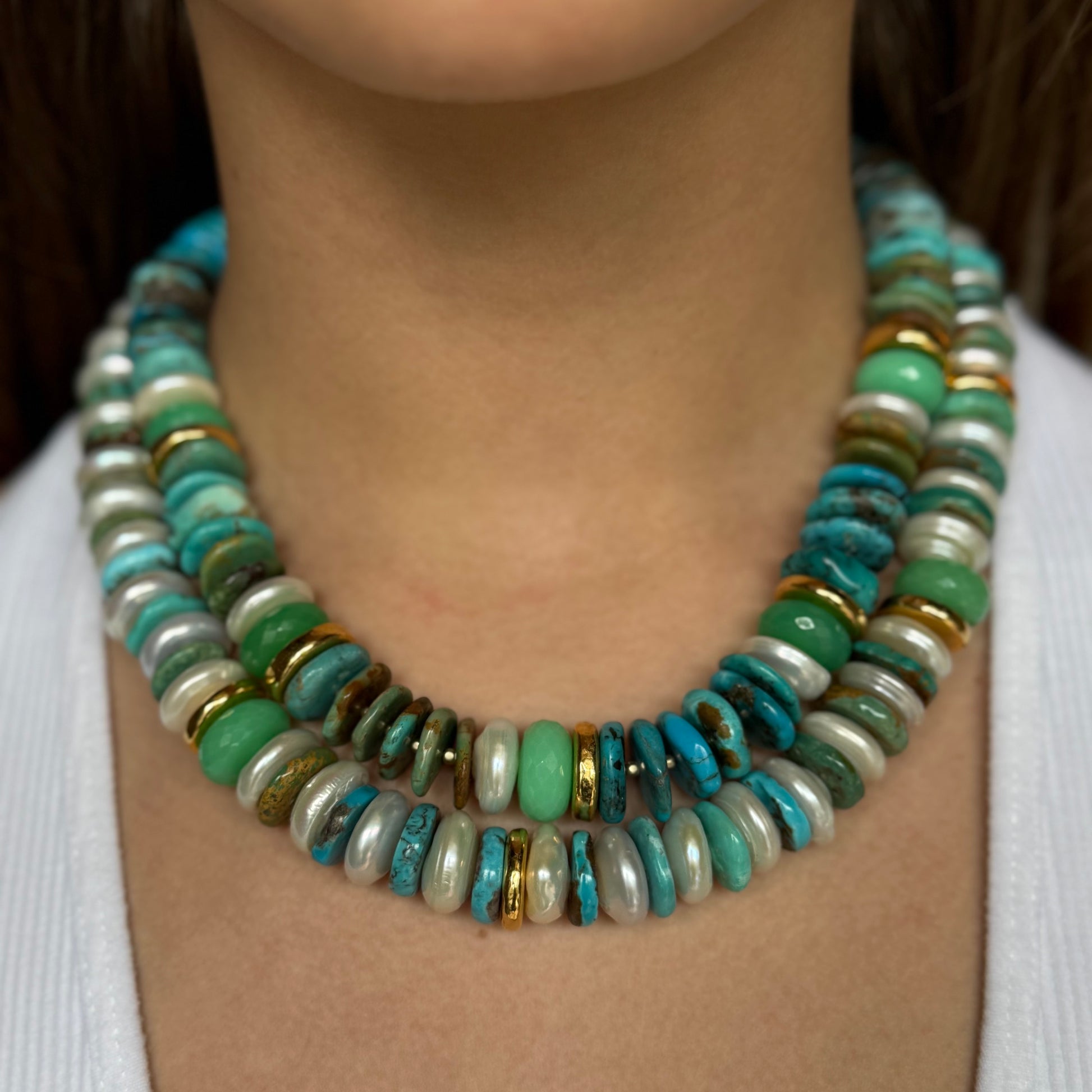 Available in 2 color ways : Turquoise Nevis and Pearl Nevis. Discover the breathtaking beauty of the Nevis Necklace, a captivating blend of nature’s finest gemstones, designed to elevate your jewelry collection. This exquisite piece is crafted from genuine turquoise, luxurious chrysoprase stones, , and freshwater pearls carefully interspersed throughout the design. Accented with delicate gold details, this necklace truly embodies a sense of refined luxury.