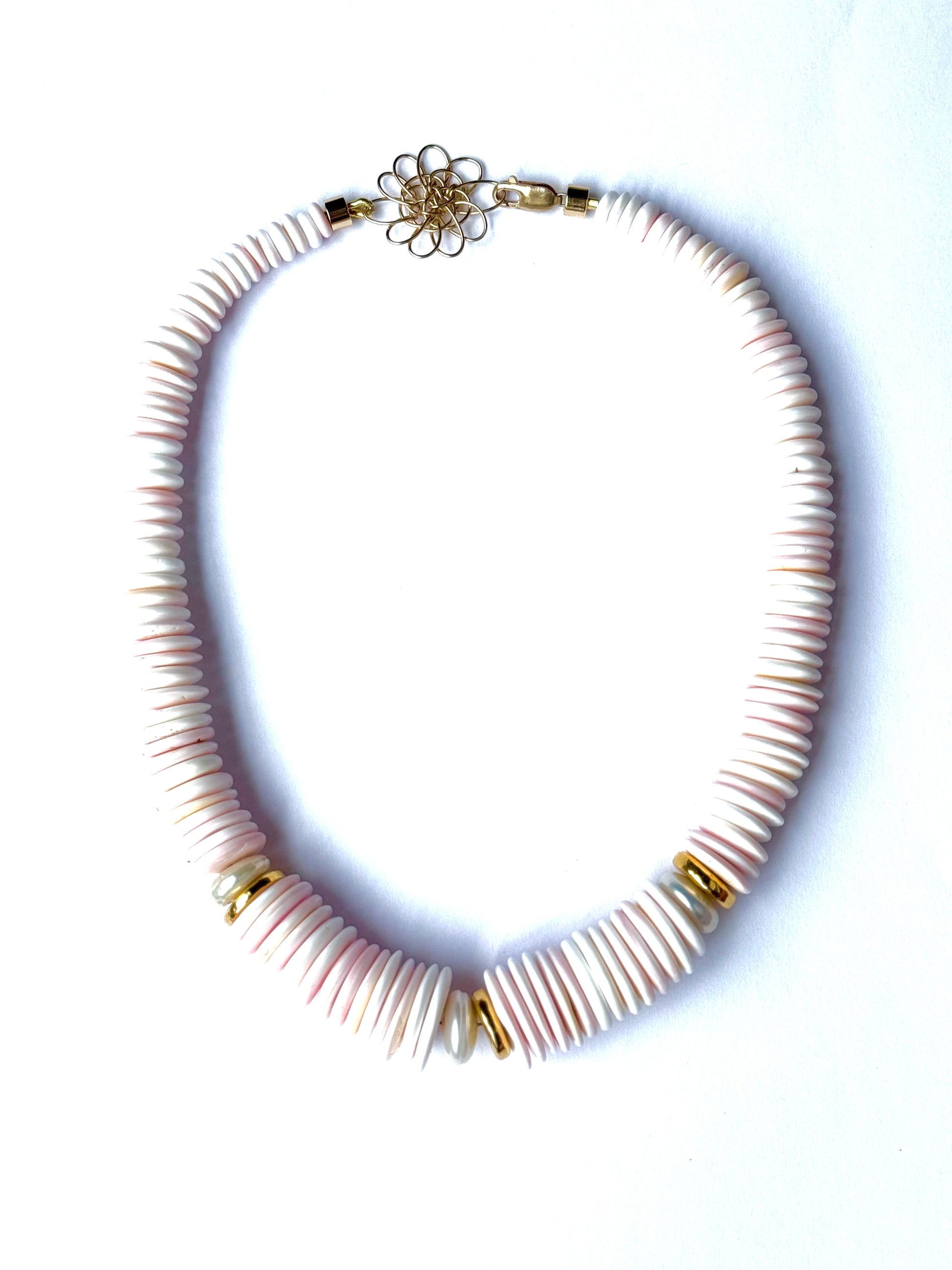 The Pink Conch necklace from the Le Lille + Cassandra Collections collab, showcases the exquisite beauty of pink conch seashells, each beautifully polished to reveal their soft, tropical hues. Delicate freshwater pearls enhance the piece, adding a touch of elegance and luster. Accented with stunning gold details, this necklace exudes sophistication and charm. The clast features a 14k gold-filled hand-woven pendant, meticulously crafted to provide a unique and elegacy flair. This statement piece effortlessly combines the serenity of the sea with the glamour of fine jewelry, making it a perfect accessory for special occasions or everyday elegance.