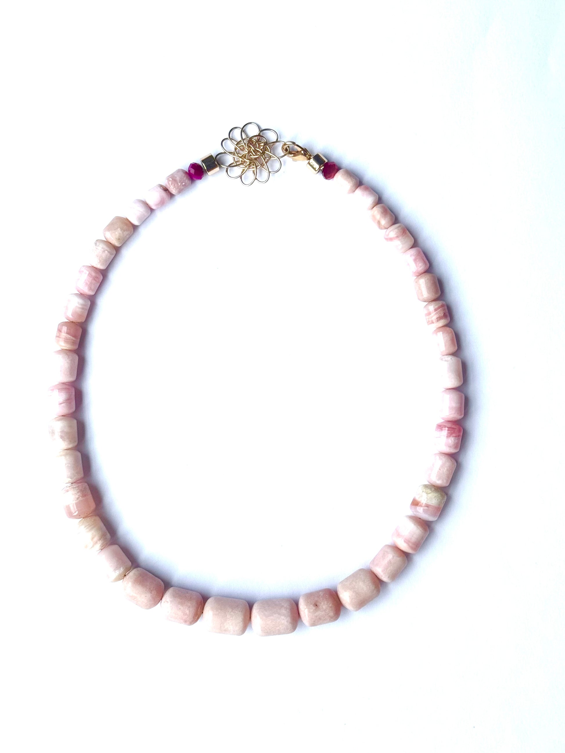 The Pink Opal necklace, from the Cassandra Collections collab, features natural graduated pink opal and a 14 kt gold filled handwoven flower pendant clasp.
