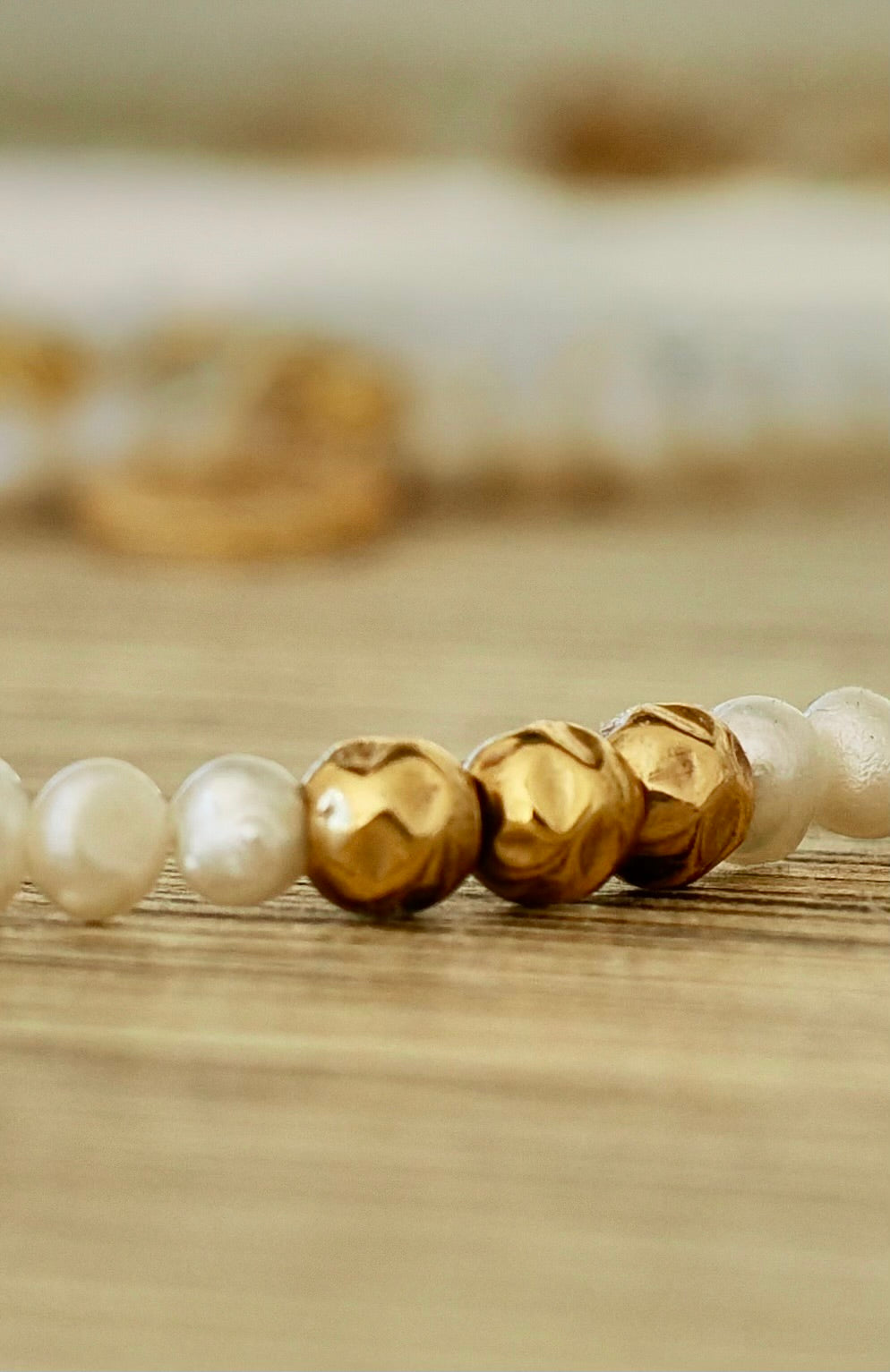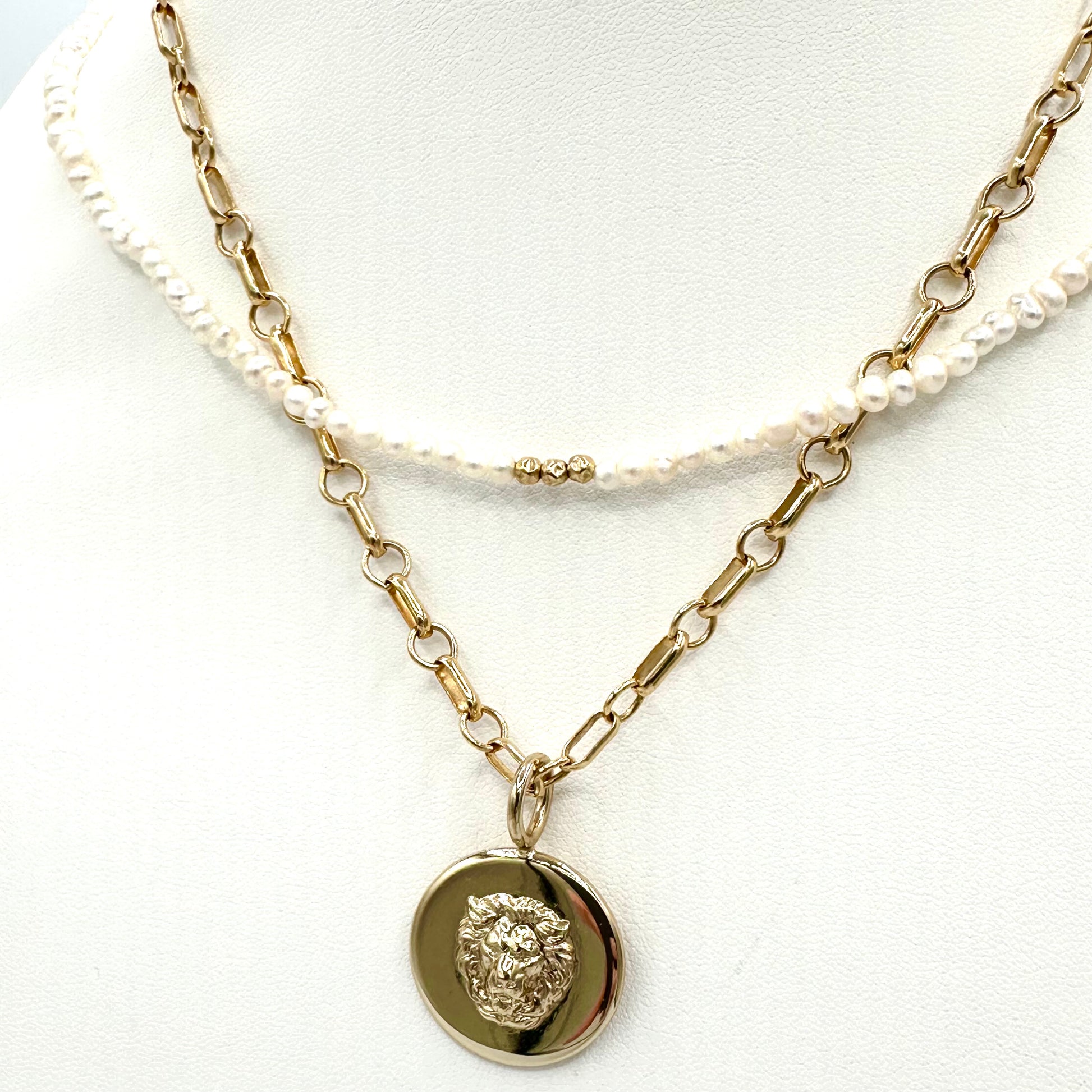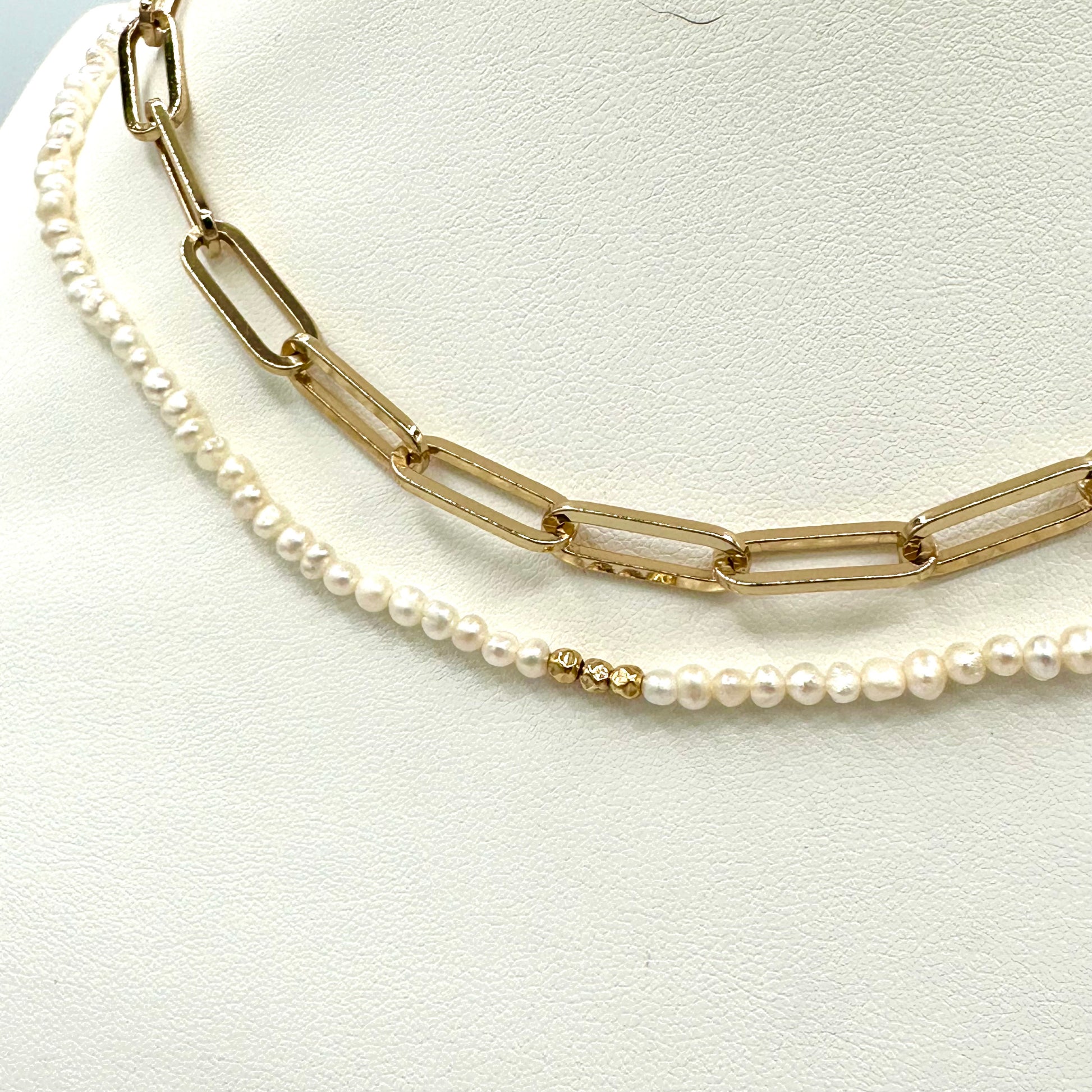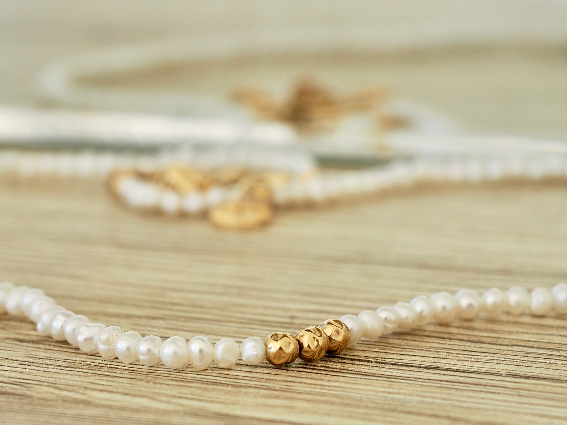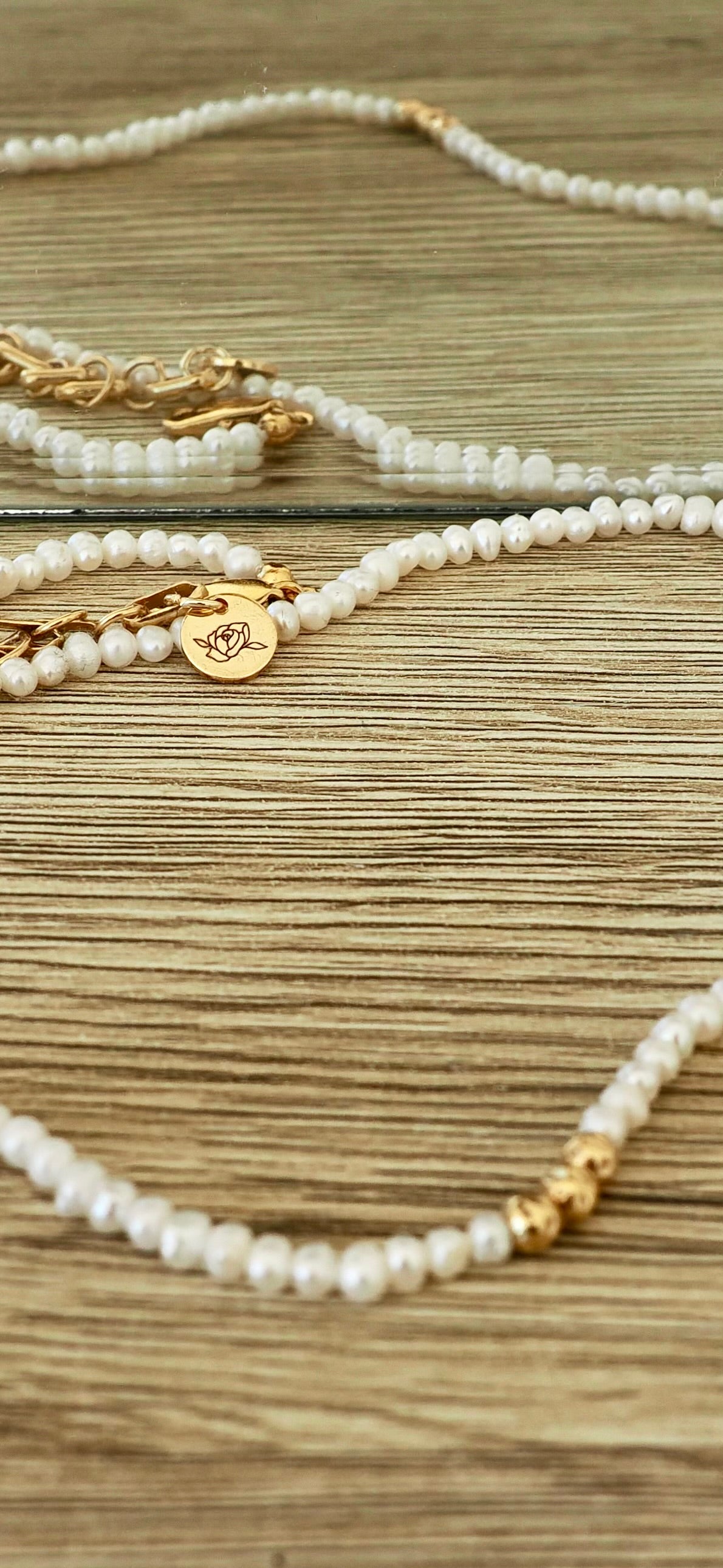 "Add a touch of elegance to any outfit with our Glow Necklace. Featuring heirloom pearls and dainty 14k gold, this versatile necklace sells out frequently. A must-have accessory that can be worn with anything!"