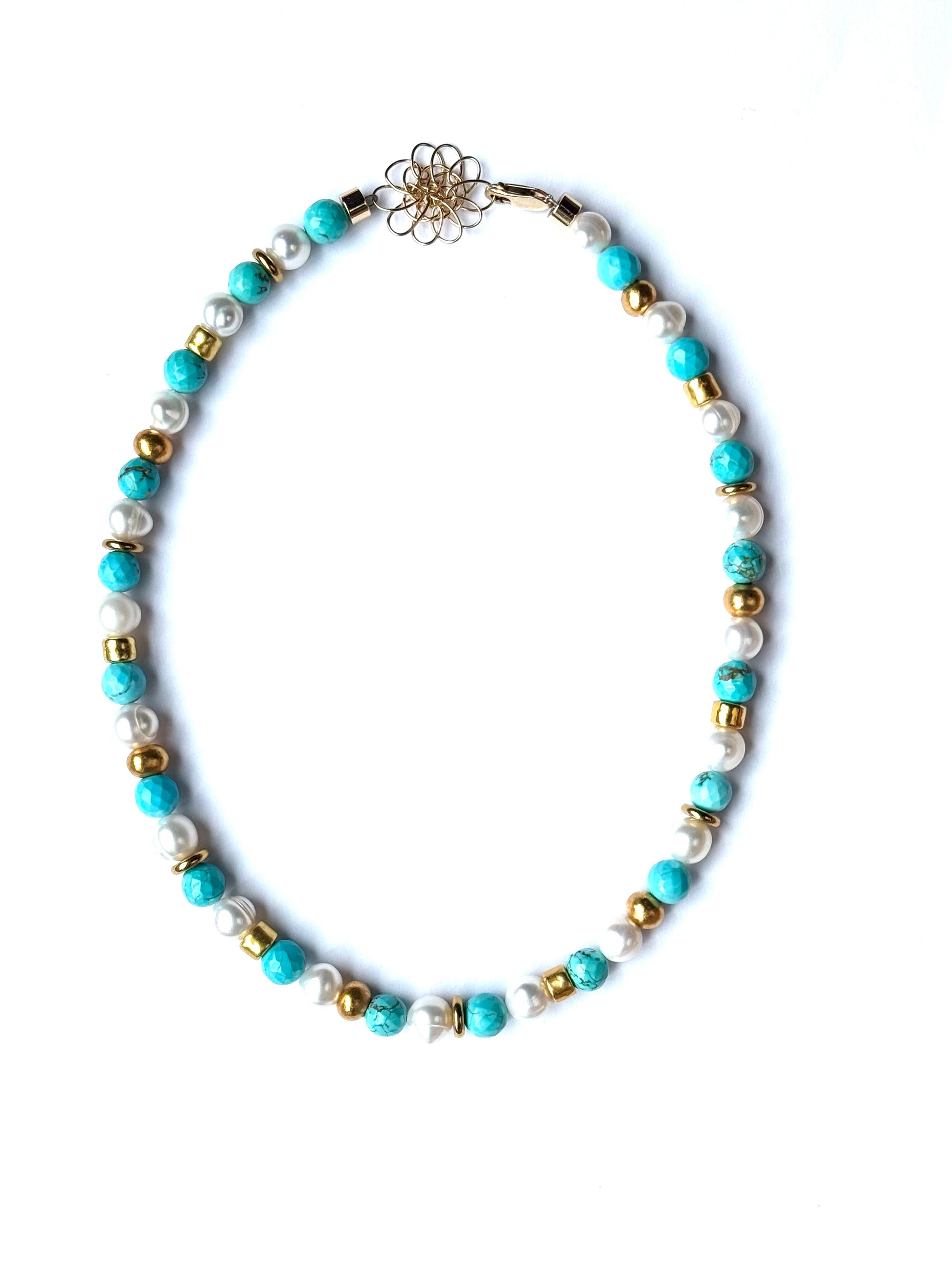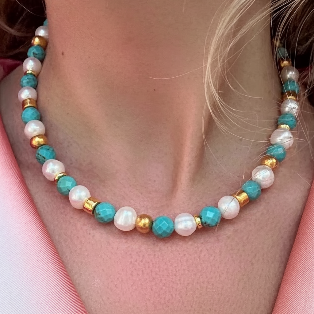 10mm Genuine Turquoise, 10mm Freshwater Pearls, gold ceramic accent beads.