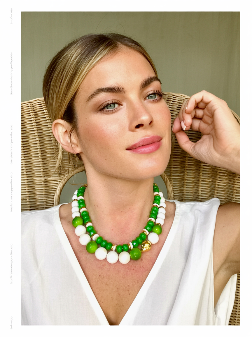 Introducing the Kimble Necklace, a stunning piece from the Cassandra Collection x Le Lille collaboration, inspired by the natural beauty of Texas. This exquisite necklace showcases a combination of white jade, green jade, natural white turquoise, and luminous freshwater pearls, creating a harmonious blend of purity and elegance.