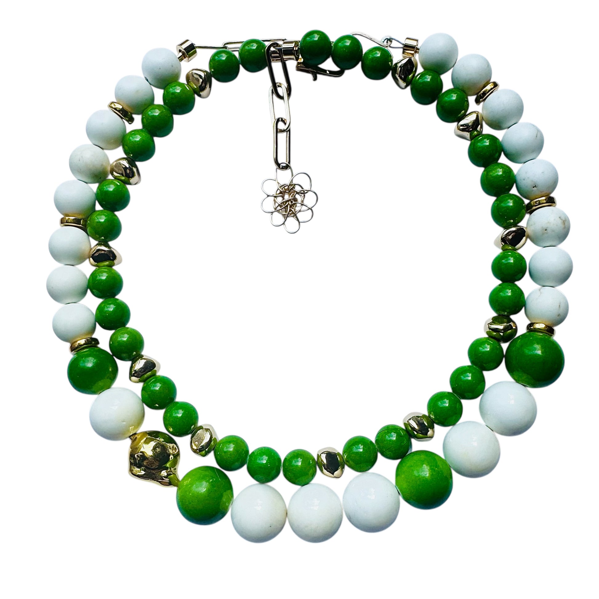 Materials : mix of 10mm-16mm stones made of Jade, natural white turquoise, freshwater pearls, gold plated pearl, ceramic gold, 14kt gold filled clasp