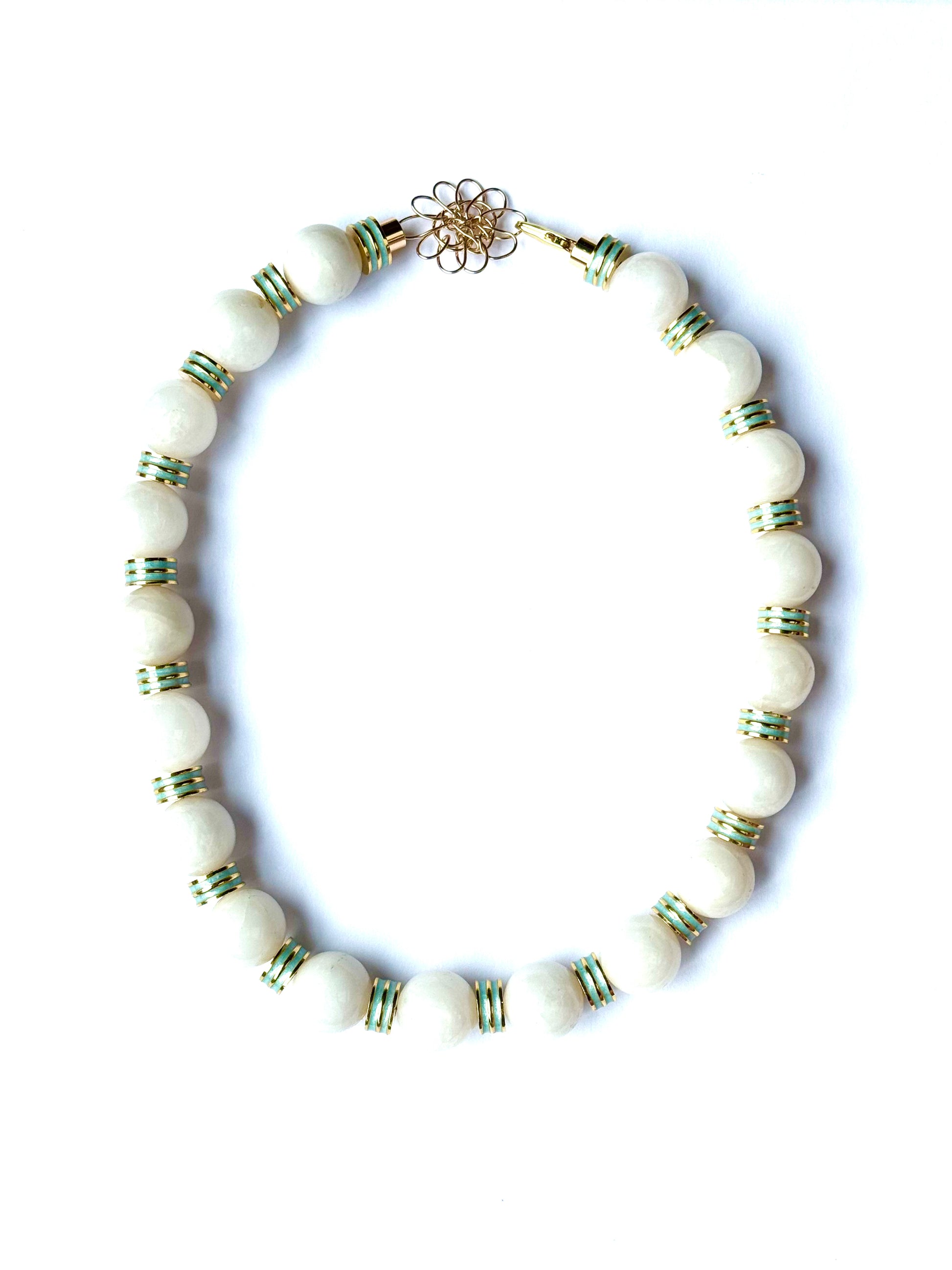 Adding a lively touch to the design, vibrant blue-green enamel gold beads are elegantly interspersed throughout the necklace. These enchanting accents provide a stunning contrast, reminiscent of tranquil ocean waves and lush greenery, creating a captivating visual experience.
